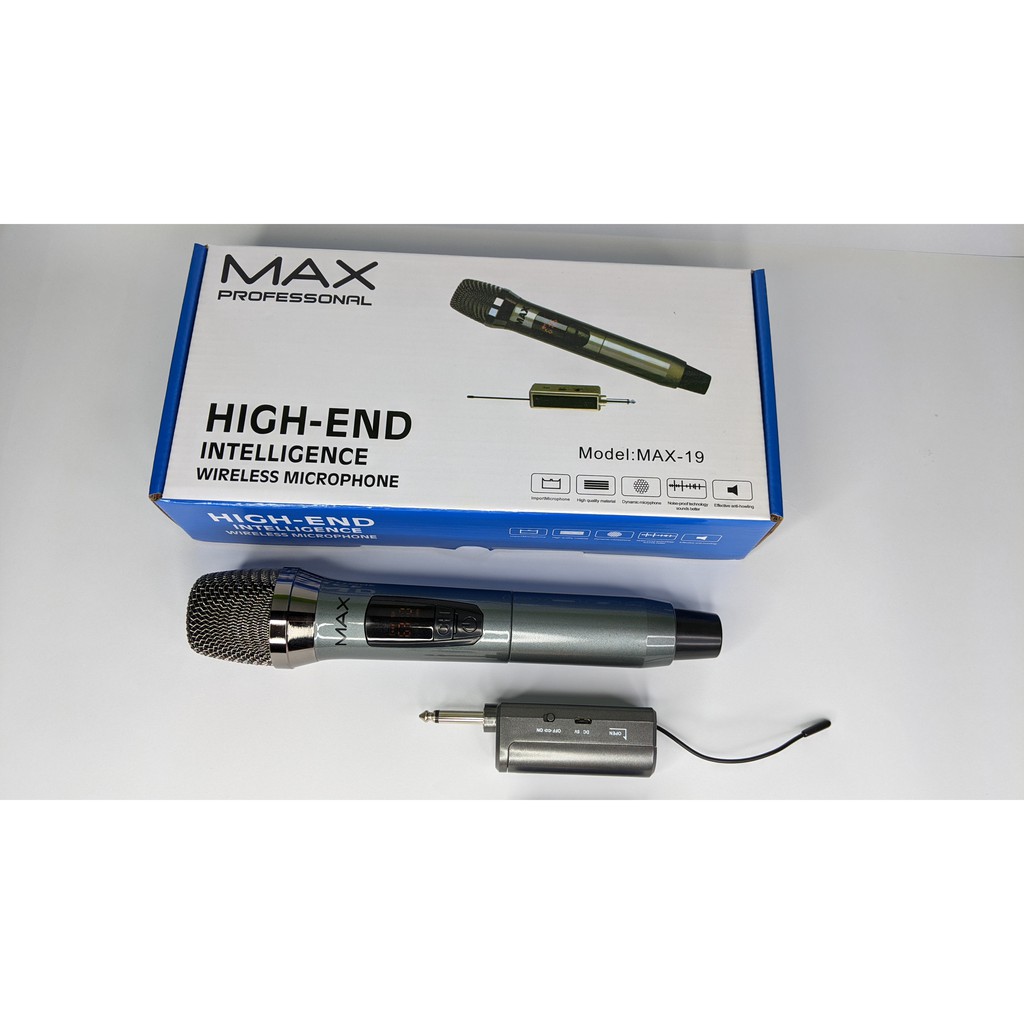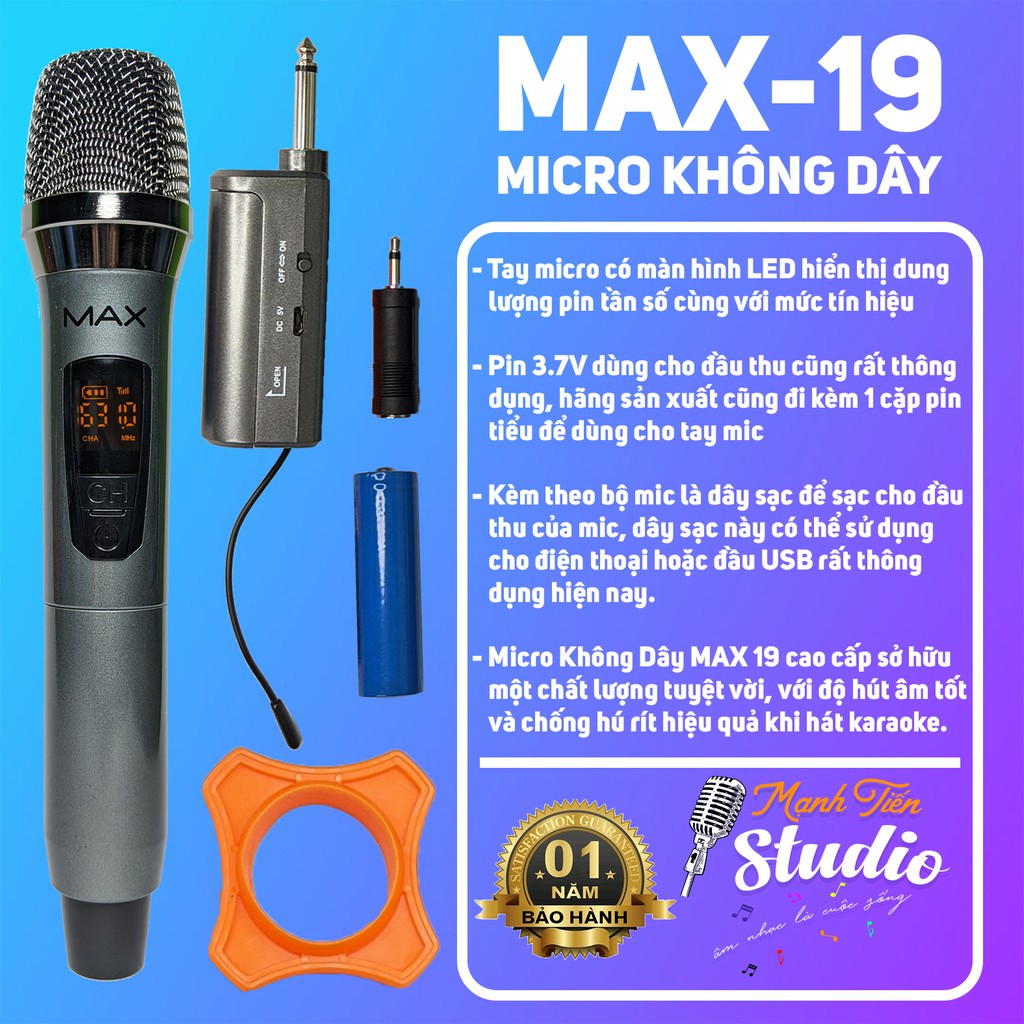– Mic không dây Max19 hoạt động trên băng tần UHF, được cải tiến hơn rất nhiều so với các sản phẩm trước cho thời gian sử dụng lâu hơn, độ ổn định cũng tốt hơn. Micro rất nhạy, âm ra rất nhẹ, hút tiếng mic rất tốt với mức giá khá mềm, là sự lựa chọn cực kì hợp lý không phải lo dây lằng nhằng, bị rối cho mọi gia đình.