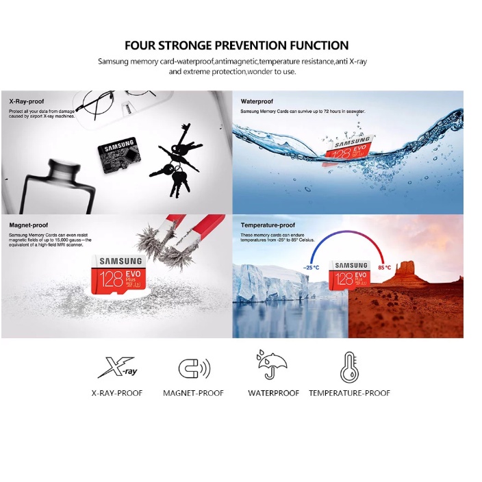 - Đặc biệt hơn, Samsung đã hoàn thiện hơn cho chiếc thẻ nhớ của mình và trang bị các chuẩn bảo vệ EVO Plus có thể chịu được tối đa 72 giờ trong nước biển, nhiệt độ khắc nghiệt, máy X-quang ở sân bay và từ trường tương đương với máy quét MRI khi gặp phải.