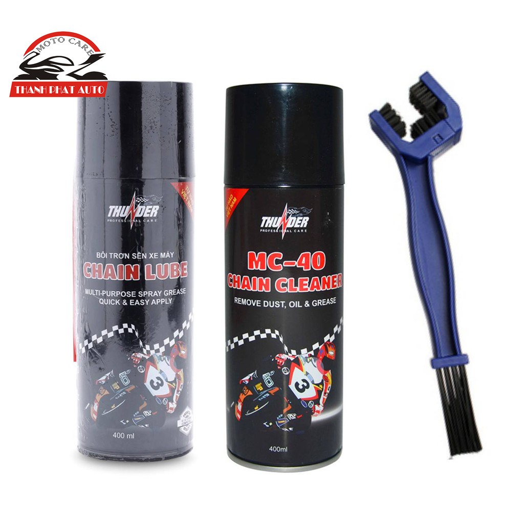 Giới thiệu sản phẩm Bộ sản phẩm vệ sinh sên MC-40 400ml, Bôi trơn dưỡng sên Thunder Chain Lube 400ml và bàn chải sên chuyên nghiệpSản phẩm bôi trơn sên xe máy với thành phần dầu gốc cao cấp và các chất phụ gia đặc biệt nhập khẩu từ Nhật giúp sên hoạt động êm ái, tránh những tiếng kêu xè xè đối với các loại sên trần qua đó gia tăng độ bền của sên, hạn chế vấn đề co giãn sên khi vận hành.