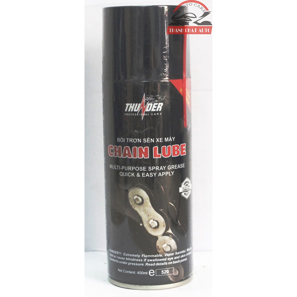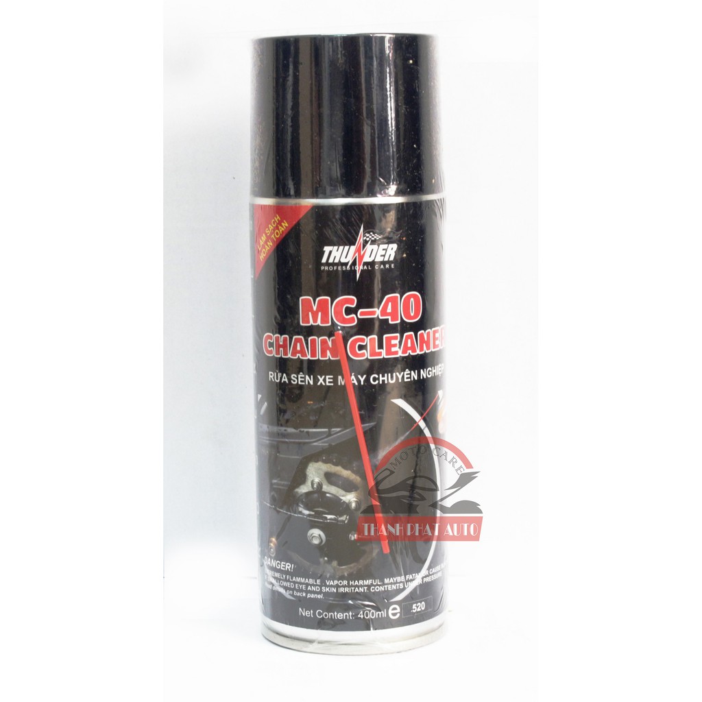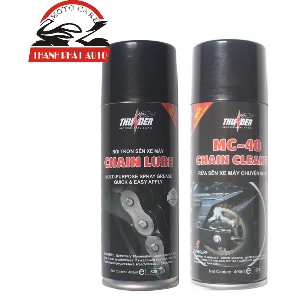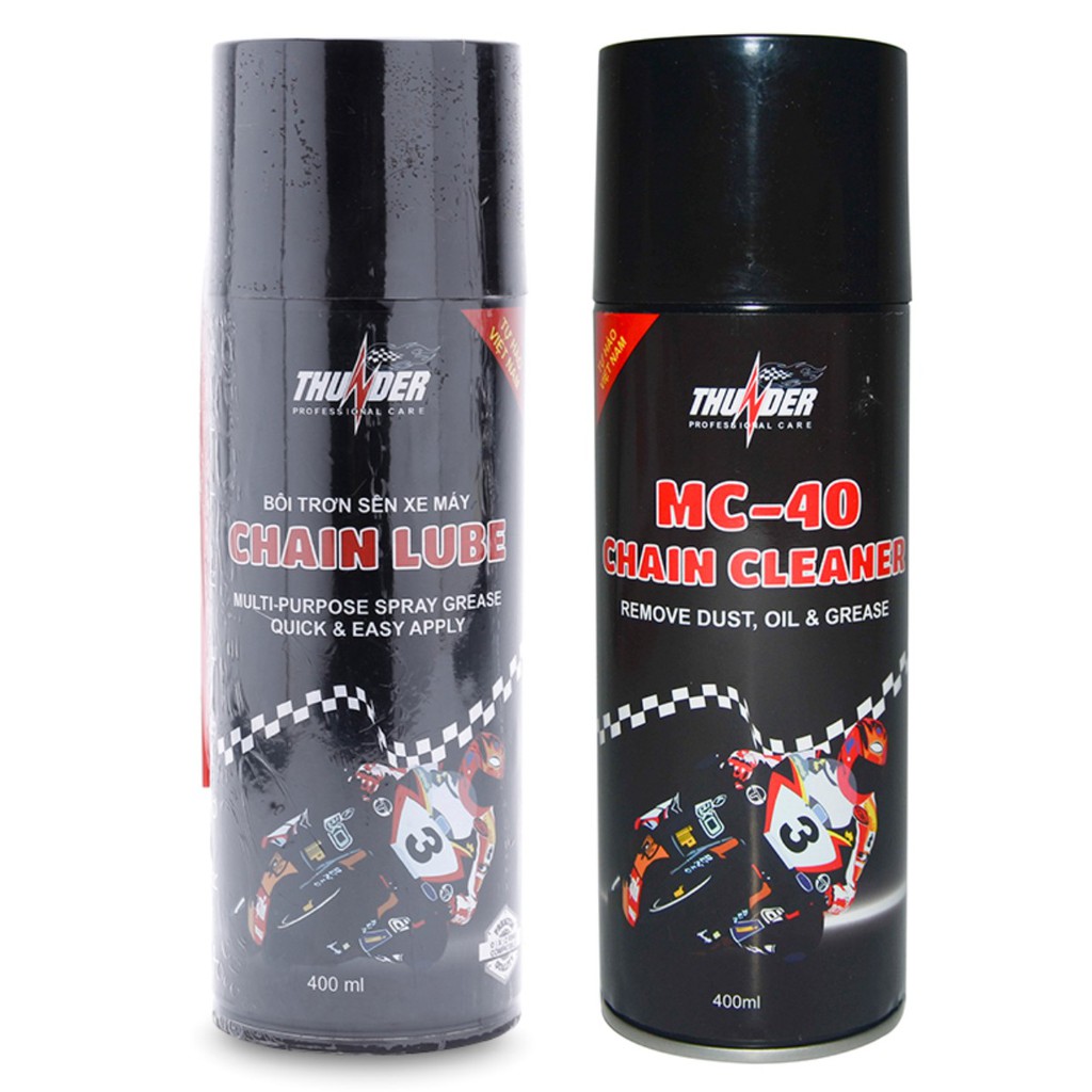 Giới thiệu sản phẩm Bộ sản phẩm vệ sinh sên MC-40 400ml, Bôi trơn dưỡng sên Thunder Chain Lube 400mlSản phẩm bôi trơn sên xe máy với thành phần dầu gốc cao cấp và các chất phụ gia đặc biệt nhập khẩu từ Nhật giúp sên hoạt động êm ái, tránh những tiếng kêu xè xè đối với các loại sên trần qua đó gia tăng độ bền của sên, hạn chế vấn đề co giãn sên khi vận hành.