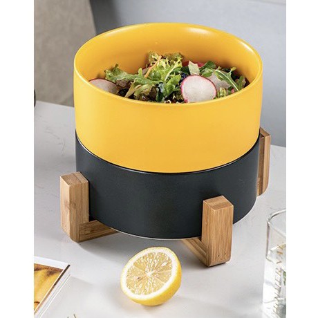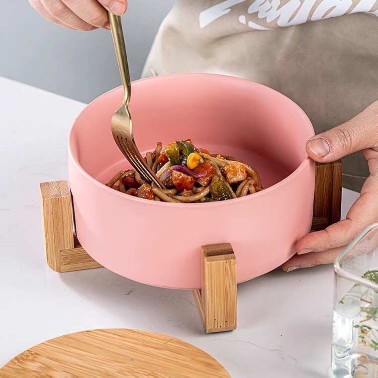 Giới thiệu (SẴN) Tô sứ kèm kệ gỗ chống nóng, tô salad sứ màu pastel phong cách Bắc Âu 16cm - Bát sứ cao cấp xuất khẩu