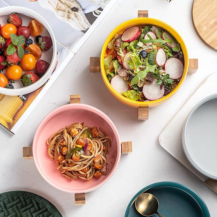 Nhà cửa & Đời sống > Bộ đồ bàn ăn > Tô || (SẴN) Tô sứ kèm kệ gỗ chống nóng, tô salad sứ màu pastel phong cách Bắc Âu 16cm - Bát sứ cao cấp xuất khẩuCòn hàng