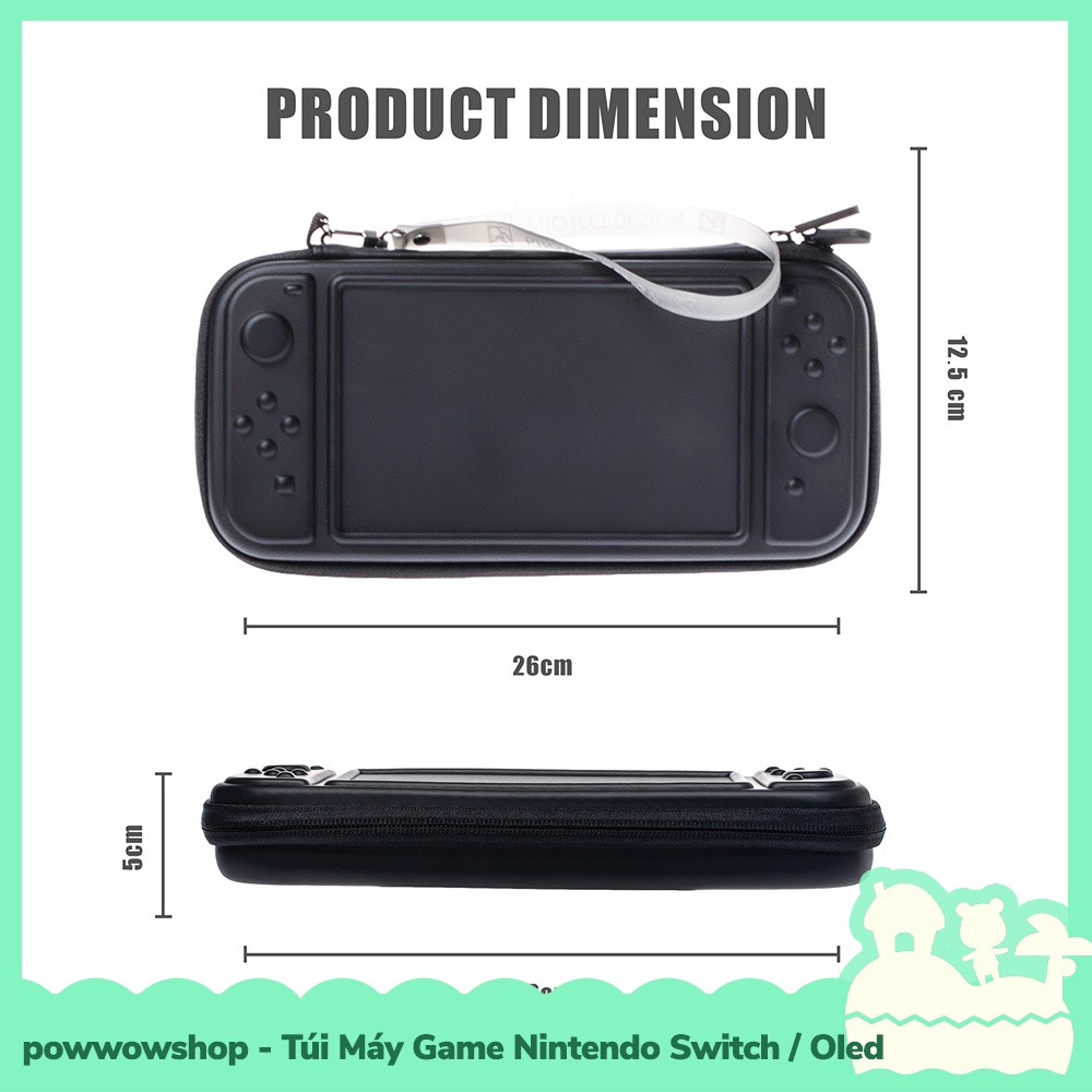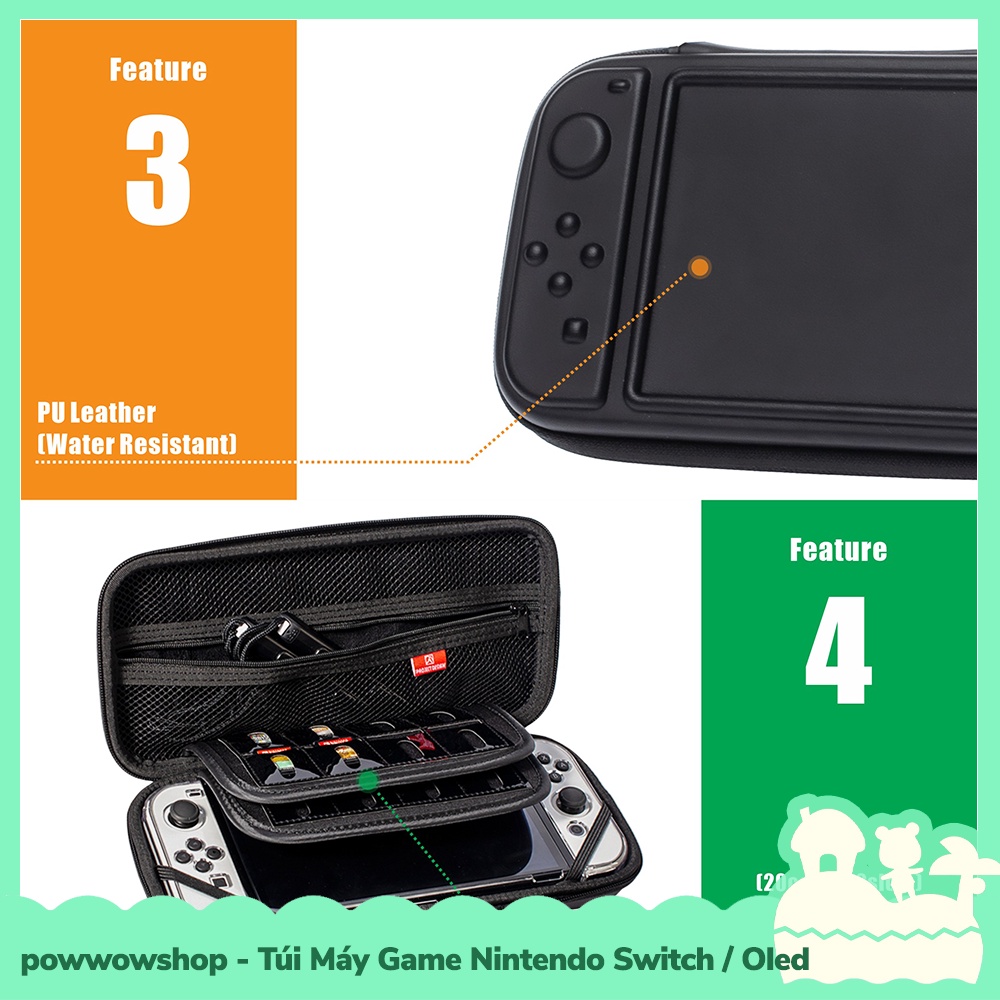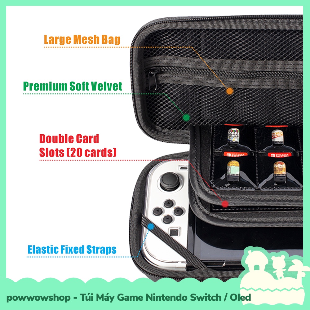 * Túi máy game có chất liệu là da PU, mặt trước được thiết kế dạng 3d theo hình ảnh máy Switch, lớp da PU sẽ dày chắc chắn, chống thấm nước và dễ dàng vệ sinh bằng khăn giấy ước, bên trong lót vải nhung, có 2 vách ngăn sốp nhung chứa 16 khoanh game, có ngăn lưới chứa phụ kiện và dây cố định máy, kích thước túi các bạn xem thêm trên hình ảnh sản phẩm, sản phẩm đã bao gồm dây đeo cổ tay bên trong túi.