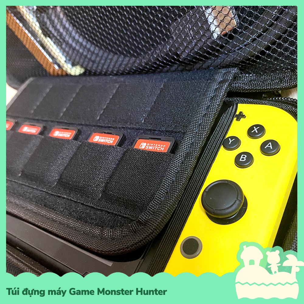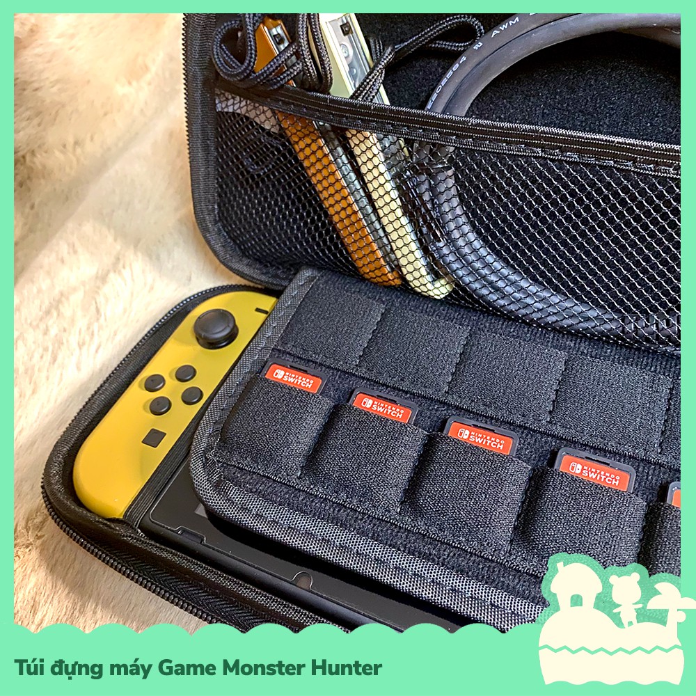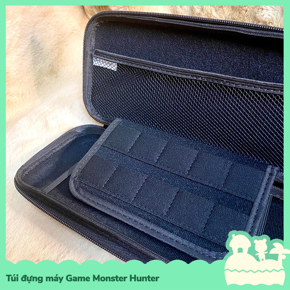 Túi đựng máy game cầm tay cho Nintendo Switch, có tặng kèm dây đeo móc vào cổ tay, chất liệu da PU chống thấm nước, chống bám bẩn, hạn chế va chạm và trầy xước, bên trong có ngăn đựng phụ kiện dạng lưới và 10 khoanh đựng thẻ game được lót nệm, có dây cài thun co dãn để cố định máy game bên trong túi, giúp máy không bị xê dịch khi di động túi đến nhiều nơi khác nhau, mẫu mã ăn theo tựa game nổi tiếng Monster Hunter trên nhiều hệ máy, chắc chắn là một phụ kiện độc đáo trong danh sách phụ kiện của bạn.