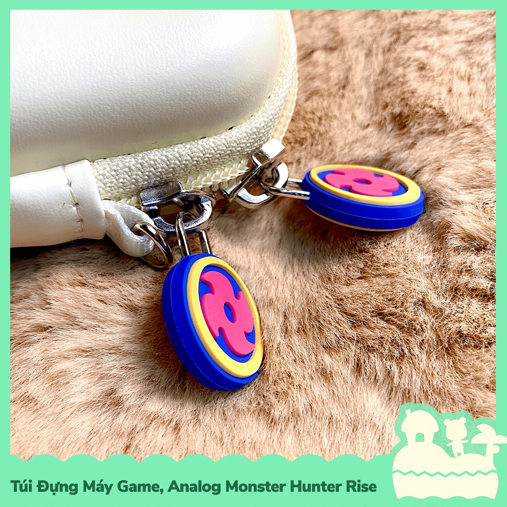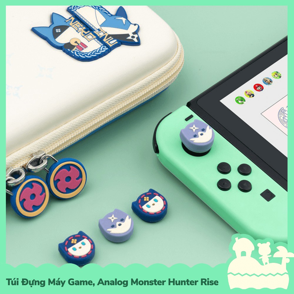 GeekShare là một trong những thương hiệu sản xuất phụ kiện Nintendo Switch, tương tự như IINE và Dobe, các thiết kế của GeekShare luôn có một phong cách rất riêng và đặc biệt, dựa theo 2 nhân vật đồng hành cùng main trong series Monster Hunter Rise, GeekShare đã tạo những chiếc túi đựng máy game và bọc nút analog joycon cực kỳ phong cách nhưng không kém cạnh xịn xò, túi đựng máy game của hãng sẽ có một họa tiệt của Palimute và Palico ở góc phải bên dưới dạng Pin được dập lên túi, mặt trước và mặt sau của túi với 2 tông màu chủ đạo là Trắng Ngà và Xanh kèm pattern Shuriken, biểu tượng của game Monster Hunter Rise đi kèm, màu sắc trên túi là dạng in lụa, nên tông độ màu cũng như độ bền của màu sẽ rất tốt, bên trong túi sẽ có một ngăn lưới để những phụ kiện linh tinh lỉnh kỉnh và khoan chứa máy game sẽ được lót bằng lớp nhung mỏng, khi các bạn sờ vào sẽ có cảm giác mát mẻ và thoáng khí tốt, đặc biệt lớp nhung này sẽ giúp túi không bị đọng quá nhiều mùi hôi, ngoài ra chúng ta sẽ có một miếng lót bằng vải sốp có khoang chứa các thẻ game và một dây cài để cố định máy bên trong túi, phần da ngoài của túi sẽ được làm bằng chất liệu da PU trơn, chống thấm nước và chống trầy xước khá tốt, bọc nút của hãng sẽ được gia công tinh xảo với hình ảnh chibi đáng yêu của palamute và palico, chất liệu của bọc nút là Gel Silica, bọc nút khá dày lên tới 1 cm và có độ mịn cao, giúp việc thoát mồ hôi trên nút bọc tốt hơn, nếu các bạn chơi game nhiều sẽ thường xuyên đổ mồ hôi và làm giảm cảm giác trải nghiệm game nếu bọc nút khá trơn thì bọc nút GeekShare sẽ thấm hút tốt hơn để bạn luôn có cảm giác tay tốt khi xoay.