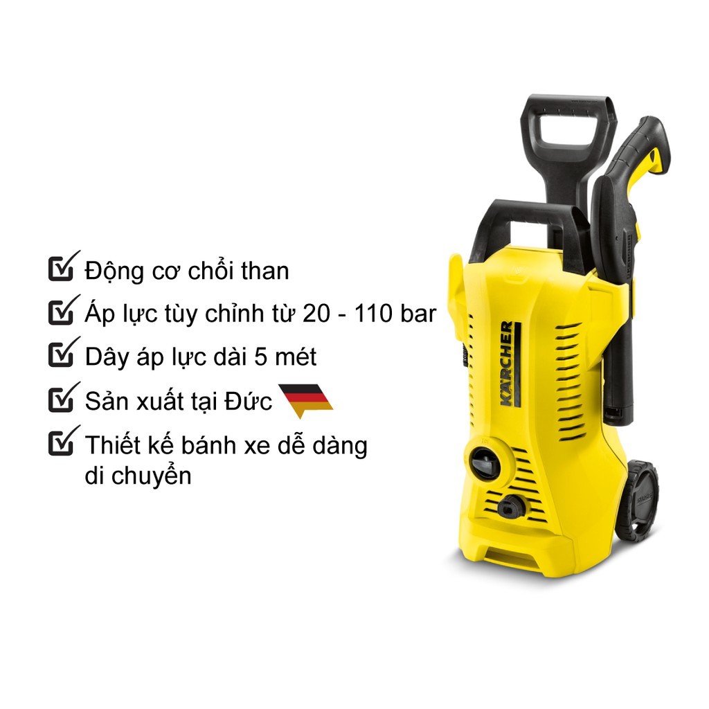 (Sản xuất Đức) Máy xịt rửa xe Karcher K2 power control car and home áp lực 20-110 bar, dây áp lực 5 mét