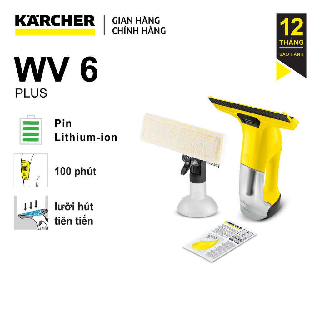 - Máy lau kính cầm tay WV 6 Plus là dòng máy lau kính dùng pin đã được Kärcher cải tiến công nghệ lưỡi hút, giúp linh hoạt hơn trong việc làm sạch và tăng thời gian sử dụng pin lên đến 100 phút.Lưỡi hút mới dài hơn cho phép bạn loại bỏ chất lỏng dư thừa khỏi toàn bộ bề mặt kính hoặc gương chỉ trong