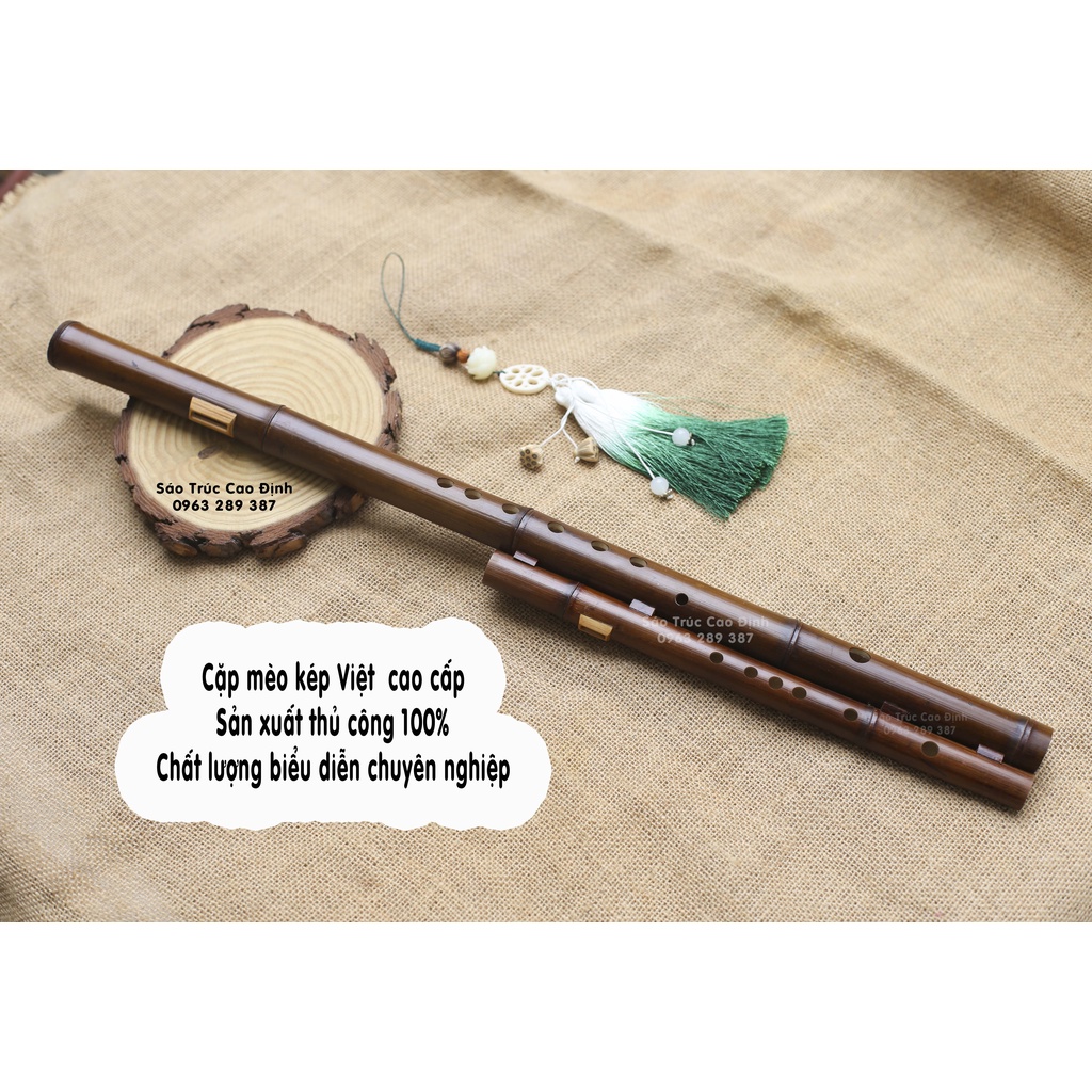 + Cặp sáo mèo kép: Cặp sáo mèo Việt thực chất là mèo nam và mèo nữ được ghép lại với nhau để thuận tiện cho việc biểu diễn khí đứng trên sân khấu chuyên nghiệp ,ưu điểm của việc gắn hai cây vào một là rất tiện khi bạn đứng diễn sân khấu tuy nhiên cũng có một nhược điểm đó là nó sẽ cồng kềnh hơn, khó mang theo và có thể tách làm hai cây bất cứ lúc nào nếu bạn làm rơi quá mạnh.