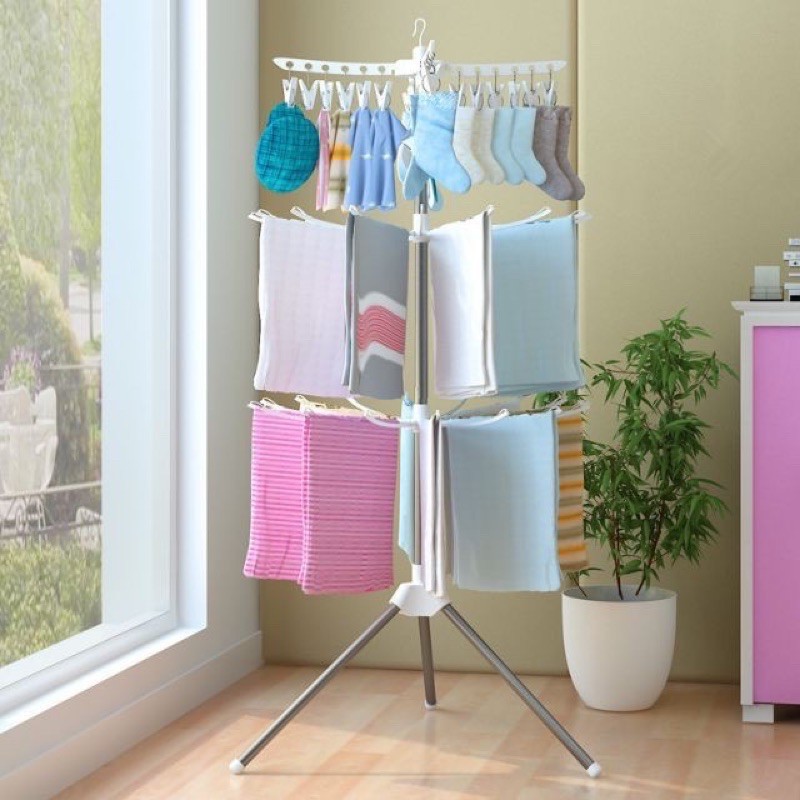 - Cây phơi quần áo 3 tầng với 3 giá phơi đồ tiện dụng, có thể gập gọn khi không sử dụng. Sản phẩm có kích thước gọn nhẹ, giúp bạn dễ dàng di chuyển khi cần thiết