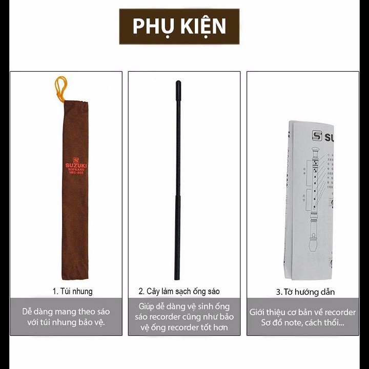 - Sáo Recorder Suzuki SRG-405 và SRG-200 là một loại sáo dọc, ít tốn hơi hơn các loại sáo trúc, tiêu, được đưa vào chương trình giáo dục âm nhạc ở trường tiểu học, trung học nước ngoài, điển hình là Nhật.
