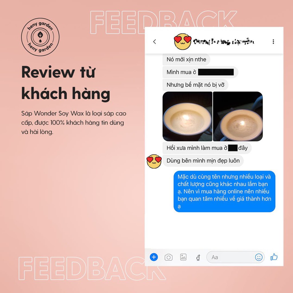 ✔️ Không bị sùi bề mặt nến: đây là dòng sáp cao cấp của Heny Garden giảm thiểu tình trạng mặt nến của bạn bị sần sùi khi bạn dùng những loại sáp đậu nành kém chất lượng khác.