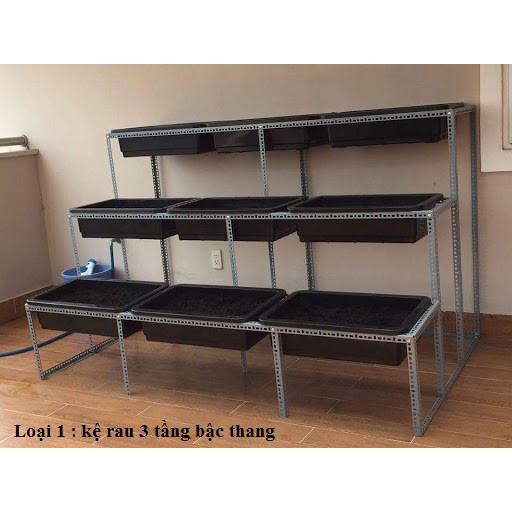 Loại 1 : kệ rau 3 tầng bậc thang . Kích thước : D2050xR1300xC1000x3 sàn gồm các phụ kiện sau