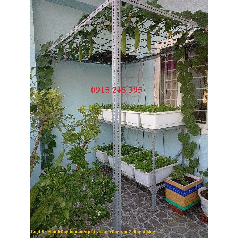 Loại 5 : giàn trồng bầu mướp bí và kệ trồng rau 2 tầng 6 khay. Kích thước giàn : D2000xR2000xC2000, kích thước kệ trồng rau D1300xR420xC1000x2 sàn. Gồm