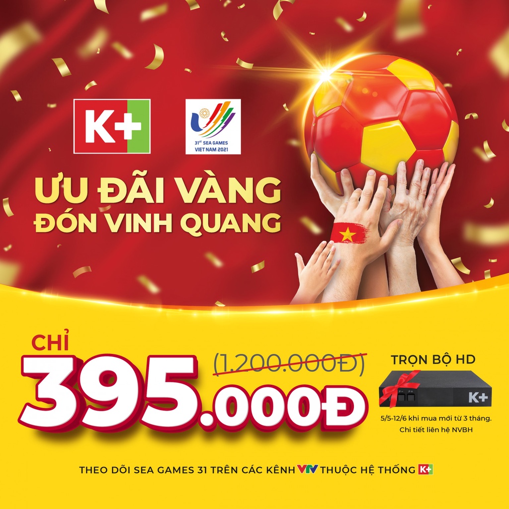 Chào đón Sea games 31 Truyền hình K+ khuyến mãi hot chỉ 79k/tháng với gói tiện lợi gia đình và gói Trọn vẹn xem bóng đá với 175k/tháng. Bộ thiết bị đầu thu K+ HD chỉ 395k, đăng ký ngay để hưởng ưu đãi nhé khách hàng.KHUYẾN MÃI CỦA TRUYỀN HÌNH K+ TRONG DIP SEA GAMES 31 NÀY LÀ: