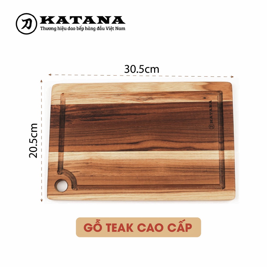 Thớt Gỗ Teak Cao Cấp KATANA - Hình Chữ Nhật - Có Rãnh và Lỗ Treo - Hàng Chính Hãng BH 12 Tháng 1 Đổi 1 Trong 7 Ngày