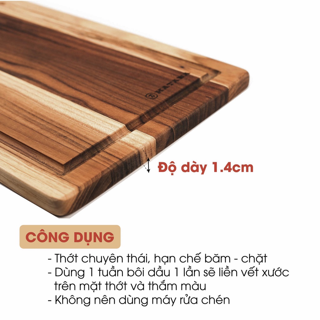 Thớt Gỗ Teak Cao Cấp KATANA - Hình Chữ Nhật - Có Rãnh và Lỗ Treo - Hàng Chính Hãng BH 12 Tháng 1 Đổi 1 Trong 7 Ngày⛔Thông tin kỹ thuật: