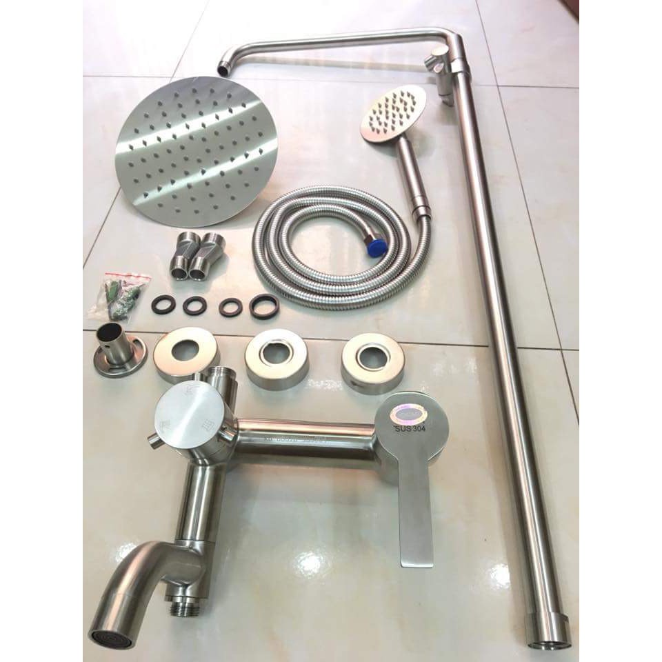 Bộ sản phẩm gồm: 1 củ sen, 1 dây dẫn nước, 1 tay sen, 1 bát sen, 1 ống đứng & các đầu ốc đi kèm.