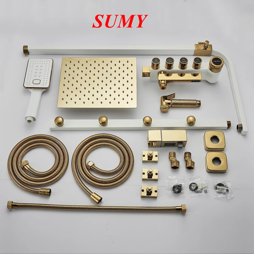 7. Thanh MassageR với 4 đầu vòi xịt tạo áp lực nước phun vào cơ thể người tắm tạo cảm giác đấm bốc, Massager, thư giãn tuyệt vời cho người dùng. Thanh Massager được làm bằng đồng, kết nối bằng dây chun vàng inox mạ crom vàng chống xoắn.
