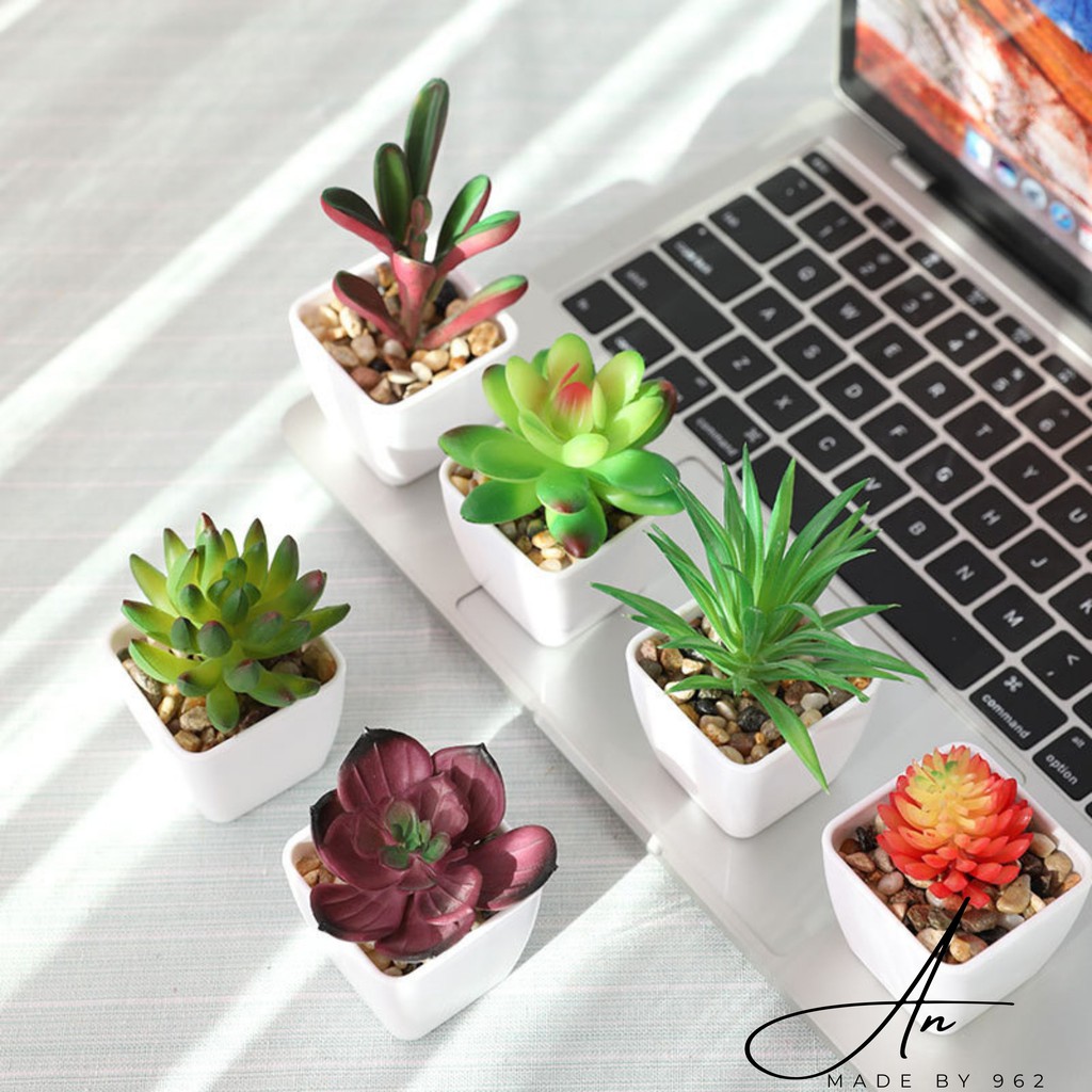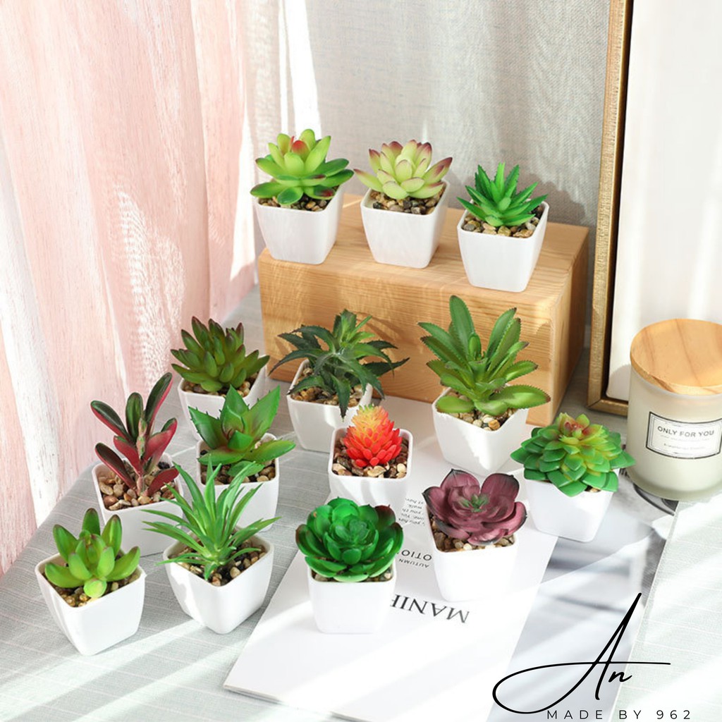Sen đá chậu sứ trắng mini, cây giả nhân tạo giống thật decor trang trí phong cách Hàn Quốc