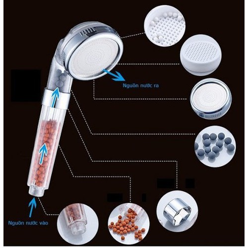 Vòi Hoa Sen Tăng Áp có cấu tạo chính từ nhựa ABS chịu lực và cường độ cao, an toàn cho sức khỏe của người sử dụng, ở những đoạn tiếp xúc là các vòng được cấu tạo bằng chất liệu Inox khử chì. Hạt nano trắng có trong vòi có tác dụng giúp khử độc cho nước, loại hạt xám có tác dụng giúp diệt khuẩn, còn hạt vàng nhiều nhất giúp lọc kim loại hòa tan, làm cho nước trở nên tinh khiết hơn