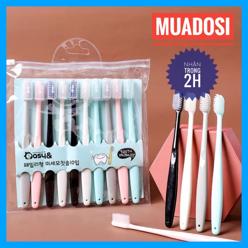Set bao gồm 10 cái bàn chải nhiều màu tặng kèm túi zipLông bàn chải mềm, không gây ảnh hưởng đến nướu và làm sụt lợi.