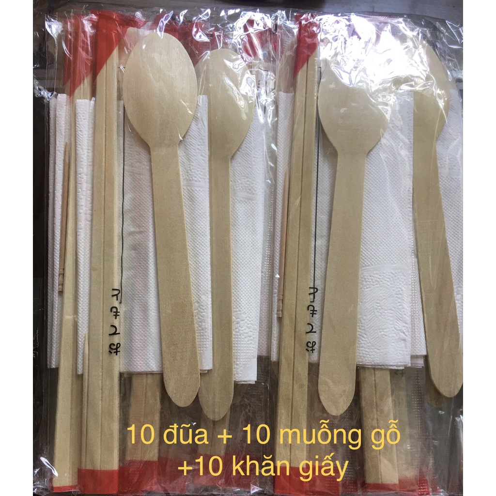 Set 10 bộ (muỗng gỗ + đũa + giấy + tăm)