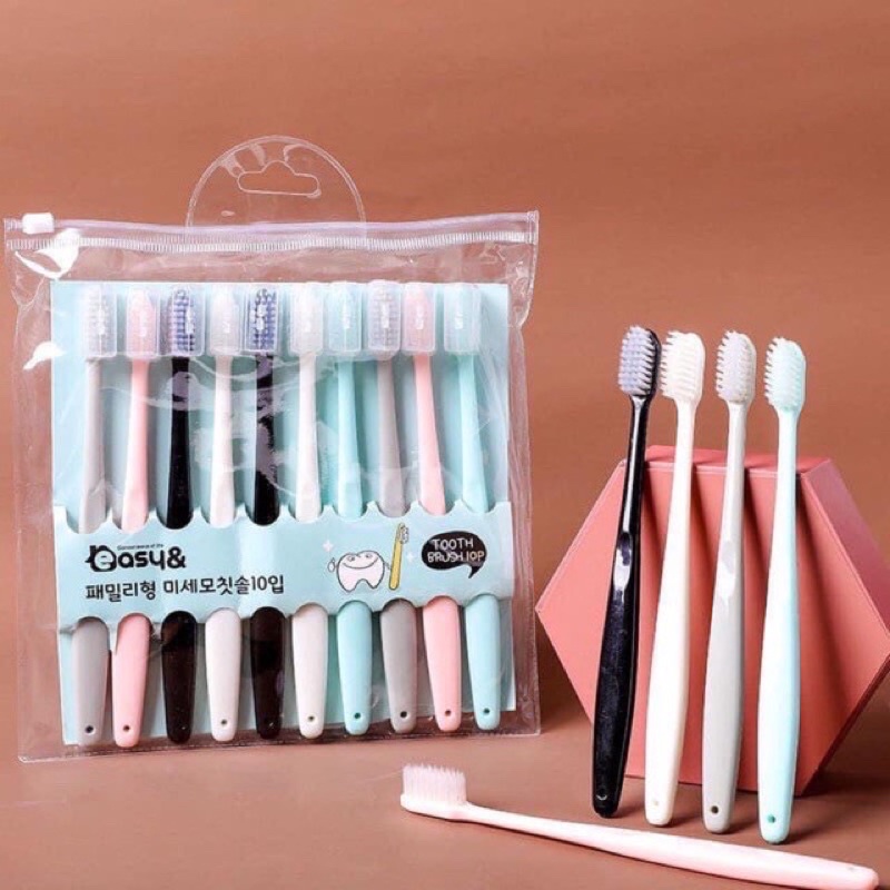 Set bao gồm 10 cái bàn chải nhiều màu tặng kèm túi zipLông bàn chải mềm, không gây ảnh hưởng đến nướu và làm sụt lợi.