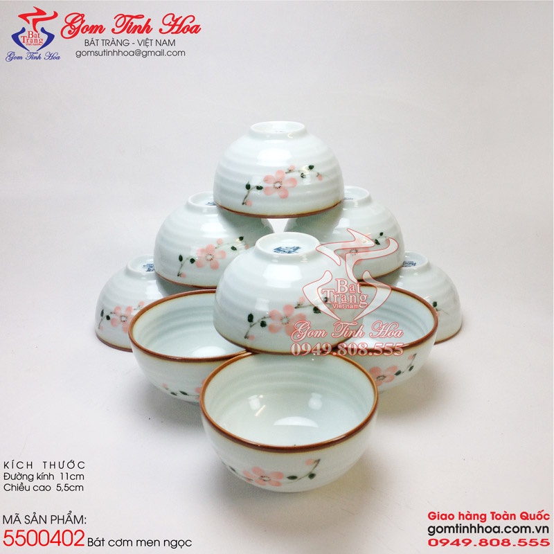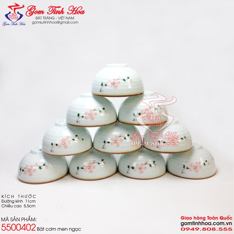 Set 10 chén bát ăn cơm gốm sứ Bát Tràng men ngọc vẽ hoa đào