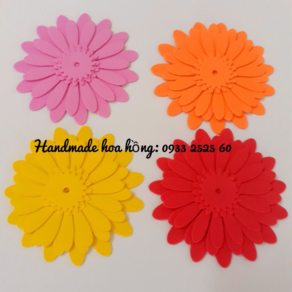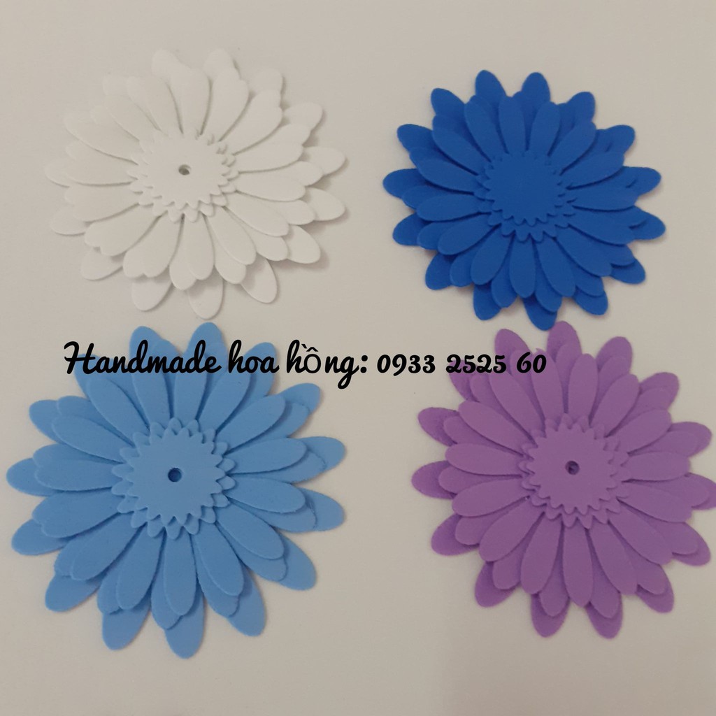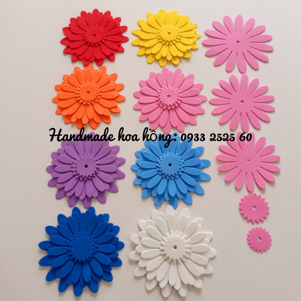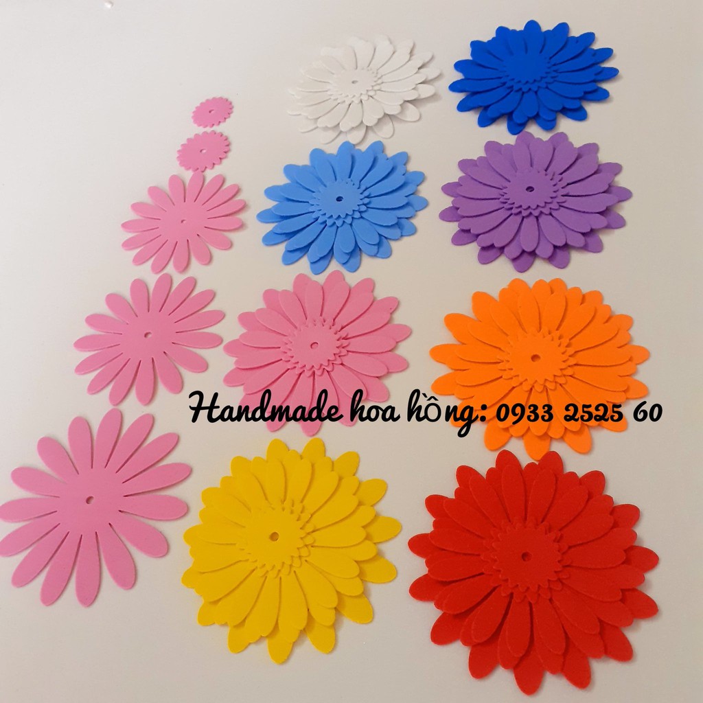 Hoa được cắt từ giấy xốp mỏng ( loại xốp dày 1mm ). XỐP NÀY KHÔNG BỊ PHAI MÀU KHI TIẾP XÚC VỚI NƯỚC, XÀ PHÒNG HAY ÁNH NẮNG.