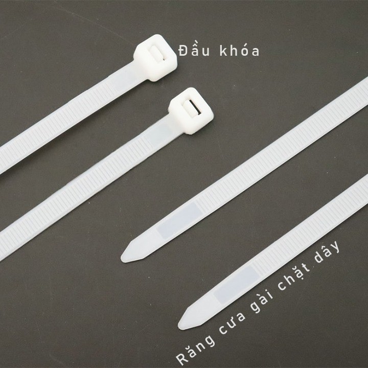 - Set 100 Dây thít nhựa đầu khóa zip với thiết kế đơn giản gồm một đầu khóa và một đoạn nhựa với nhiều răng cưa trải dài từ đầu khóa xuống dưới chui cắm giúp gài chặt dây