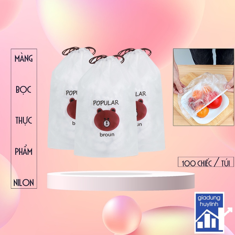 Set 100 màng bọc thực phẩm PE có chun bọc đồ ăn kèm túi gấu - Mũ chùm đầu co giãn dùng 1 lần (TNL100)