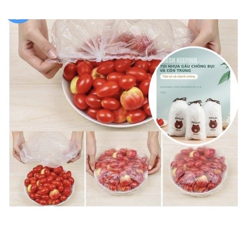 Giới thiệu SÉT 100 MÀNG BỌC THỰC PHẨM TÚI GẤU,MÀNG BỌC THỰC PHẨM PE CÓ CHUN BỌC ĐỔ ĂN CO GIÃN TÁI SỬ DỤNG
