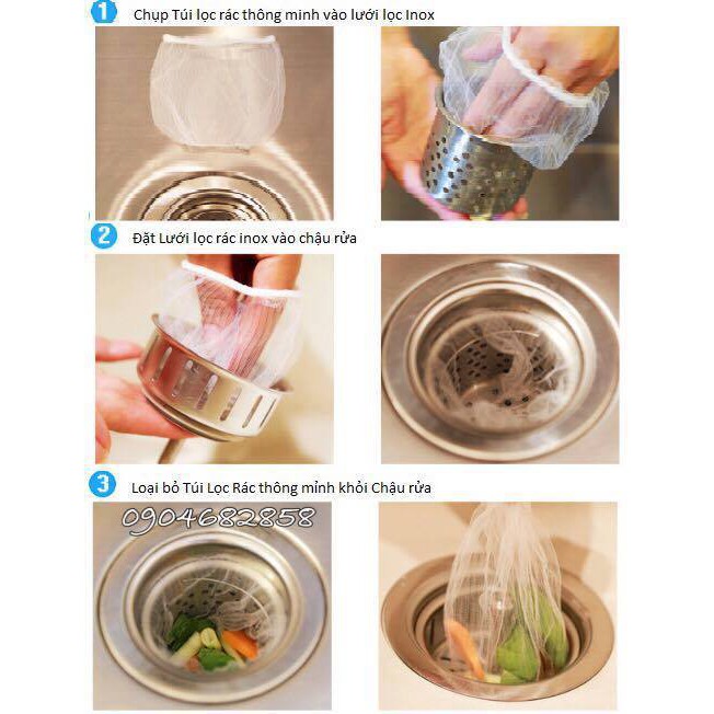 Lợi ích tuyệt vời khi sử dụng túi lọc rác thông minh - 1 túi gồm 100 chiếc:+/ Sau mỗi lần nấu nướng, chỉ cần lôi túi rác ra khỏi lưới lọc và bỏ vào thùng rác, túi làm từ sợi ko dệt nên rất an toàn và thân thiện với môi trường.