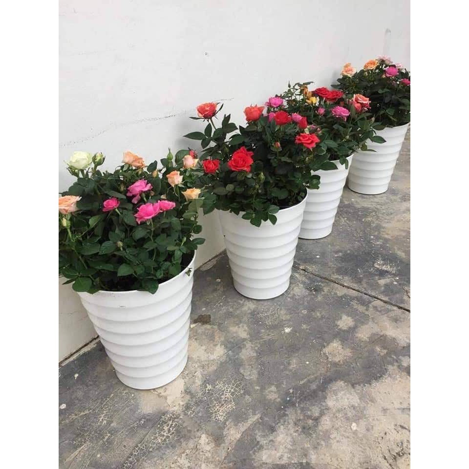set 2 chậu gân xoắn to ĐK 32cm kèm lót đĩaLà loại chậu tròn lớn là loại chậu tròn dáng cao thanh thoát, thường được sử dụng để trồng hoa, những cây có lá, mục đích tạo không gian xanh tự nhiên trang trí ngôi nhà của bạn. Với kiểu dáng trang nhã, đơn giản nhưng cũng rất sang trọng, sành điệu sẽ giúp cho hoa của bạn thêm tươi thắm.