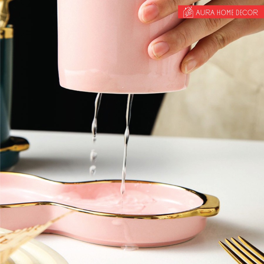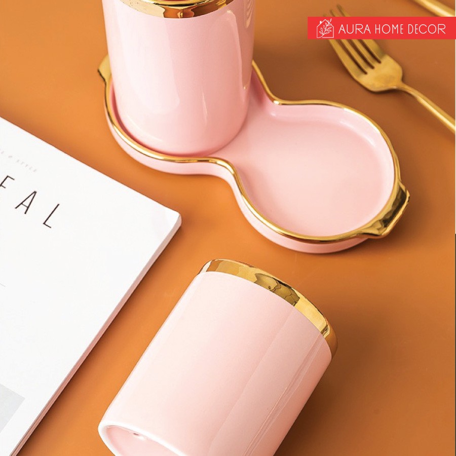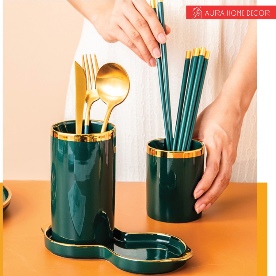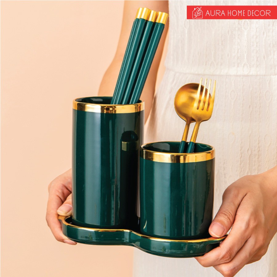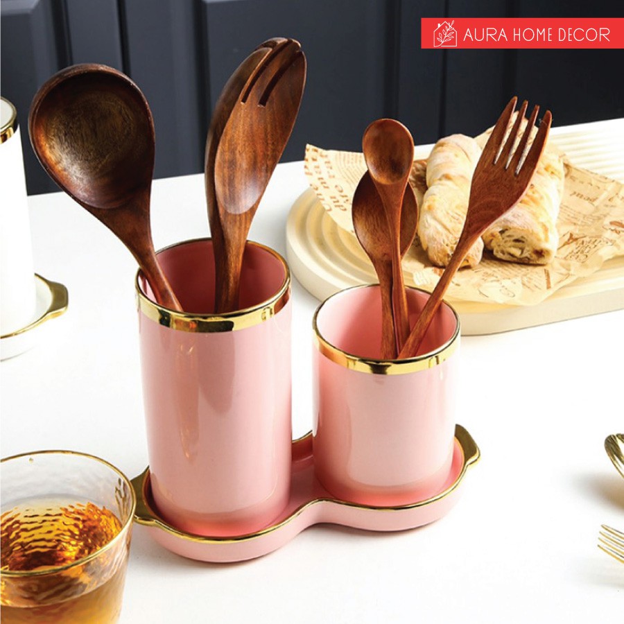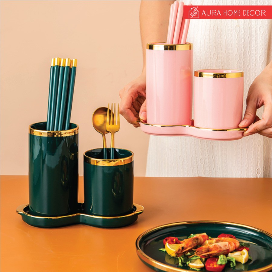 Set 2 hũ đựng đũa kèm đĩa hứng nước cực sang chảnh với màu xanh cổ vịt/ hồng viền vàng
