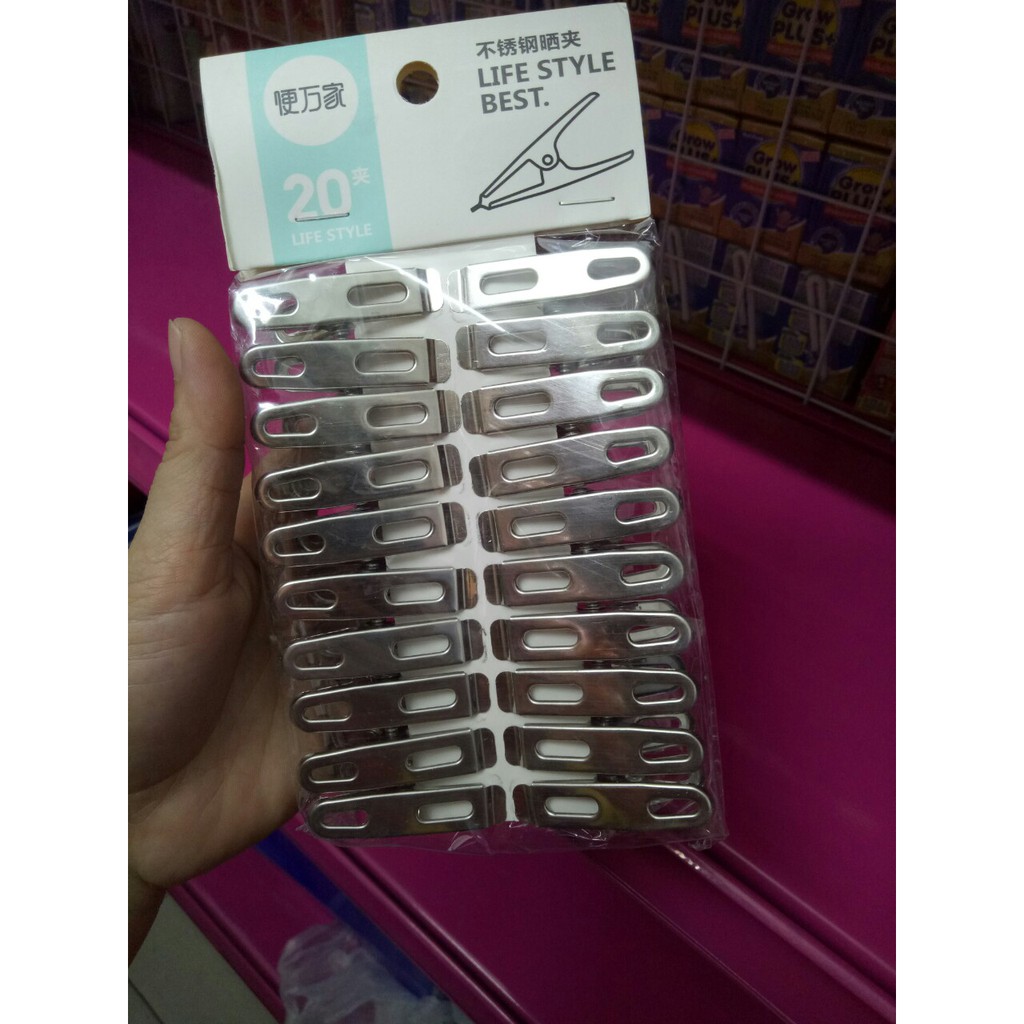 Set 20 chiếc kẹp phơi đồ tiện lợiSet 20 chiếc kẹp phơi đồ tiện lợiSet 20 chiếc kẹp phơi đồ tiện lợi. Giá bán cho 1 set gồm 20 chiếc kẹp giúp hỗ trợ các mẹ phơi đồ đc dễ dàng hơn. Có 2 loai: nhựa và inox nhé. Nói chung cm lấy loại nào cũng đẹp, cũng chất lượng ạ.Giá RICKY