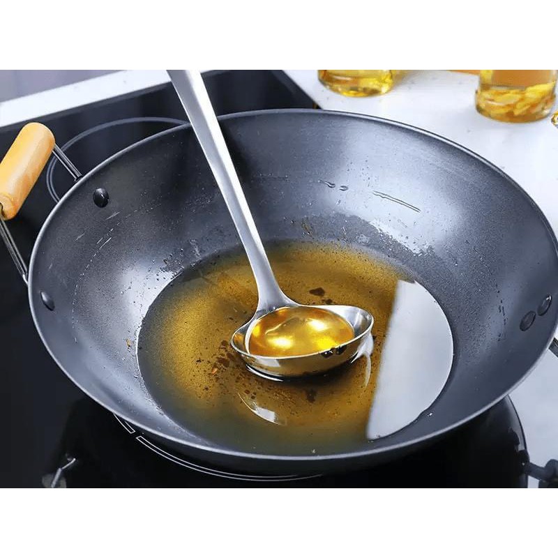 Cách 2: Cho giấy lên 1 cái muôi thùng ăn lẩu rồi rót dầu qua.