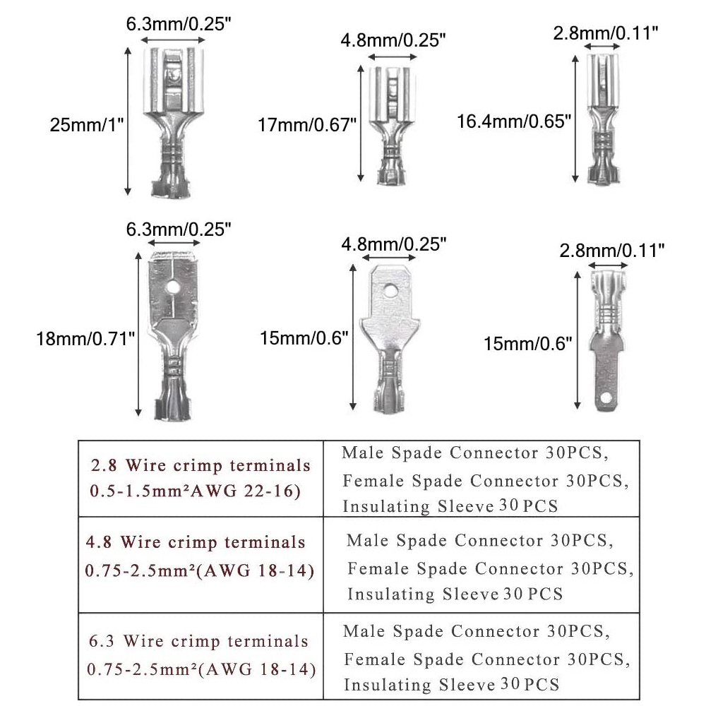 - Bộ dụng cụ kết nối thiết bị đầu cuối đực và cái bao gồm 2,8mm, 4,8mm, 6,3mm loại tổng cộng 180 miếng.