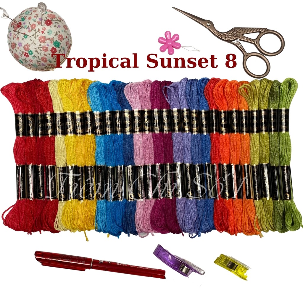 Chỉ thêu cotton Airo của hãng Cherish, một trong những hãng chỉ thêu tốt nhất của Trung Quốc. Chỉ của hãng Airo được làm từ sợi eco- cotton nên có rất nhiều ưu điểm vượt trội so với chỉ cotton thông thường. Chỉ Airo sáng mượt, bóng hơn, không phai và ít xù, nếu so với giá tiền thì thực sự là chất lượng vượt trội so với các hãng chỉ khác. Vậy nên mọi người yên tâm về chất lượng nha.Set chỉ gồm 28 màu chỉ đã được mix bằng tất cả sự tỉ mỉ để tạo nên một set tông màu Nổi rất đẹp. Có tất cả 3 set tông màu Nổi là Tropical Sunset 8, Retro 9 và Lollipop 10, hình đại diện bên ngoài là ảnh chụp cả 3 set. Mọi người xem kỹ ảnh phân loại để lựa chọn nhé.