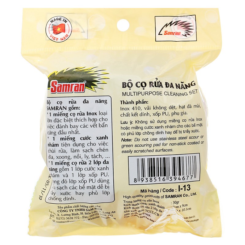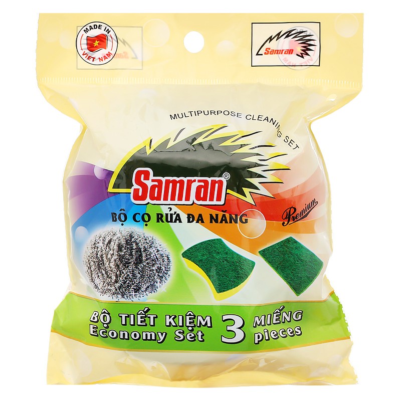 Bộ cọ rửa đa năng bao gồm 1 miếng cọ rửa inox loại lớn đặc biệt thích hợp cho việc đánh bay các vết bẩn cứng đầu nhất. Một miếng cước xanh nhám tiện dụng cho việc chùi rửa làm sạch chén, dĩa, xoong, nồi, ly, tách. Một miếng cọ rửa 2 lớp đa năng gồm 1 lớp cước xanh nhám và lớp xốp PU, trong đó lớp xốp PU dùng để làm sạch các bề mặt dễ bị trầy xước hay phủ lớp chống dính.Cọ rửa đa năng Samran đánh bay các vết bẩn, vết cháy, vết ố,.. cứng đầu nhất. Chùi rửa, làm sạch chén dĩa, xoong, nồi, ly, tách.
