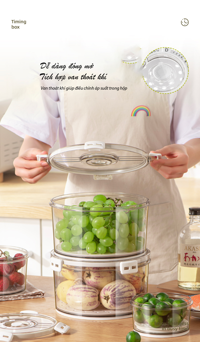 (có thể tháo rời tuỳ mục đích sử dụng) - Nắp khóa đôi chắc chắn, lỗ thông hơi trên nắp có thể được mở hoặc đóng điều chỉnh không khí, độ ẩm theo các loại trái cây và rau quả khác nhau, kéo dài thời gian giữ tươi