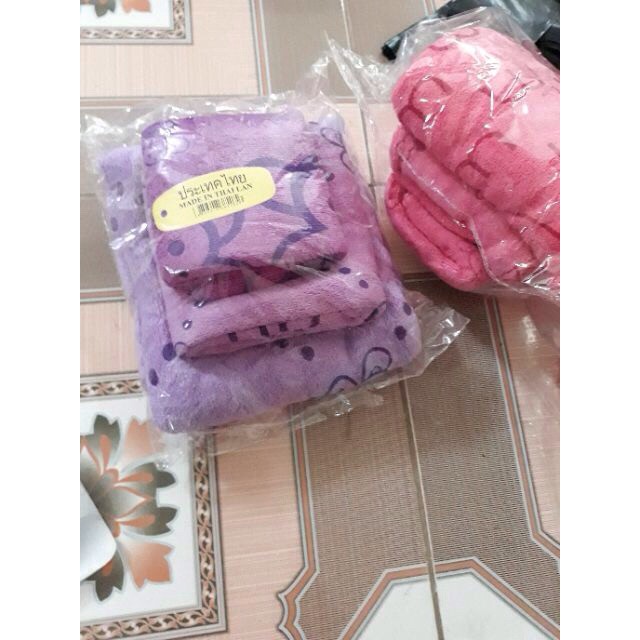 sét 3 khăn tắm, khăn mặt và khăn gội đầu cho cả gia đình. khăn bông mềm 100% cotton mịn màng, thấm hút tốt cho cả gia đình. sp nk từ thái lan.sét 1m gồm: khăn mặt 22*45, khăn gội 35*70, khăn tắm 50*100 ( lưu ý hình của 1 sét 3 khăn có thể khác nhau nhé, sét tím lô này về k đều mầu hơi nhạt và hơi đậm 1 chút xíu)