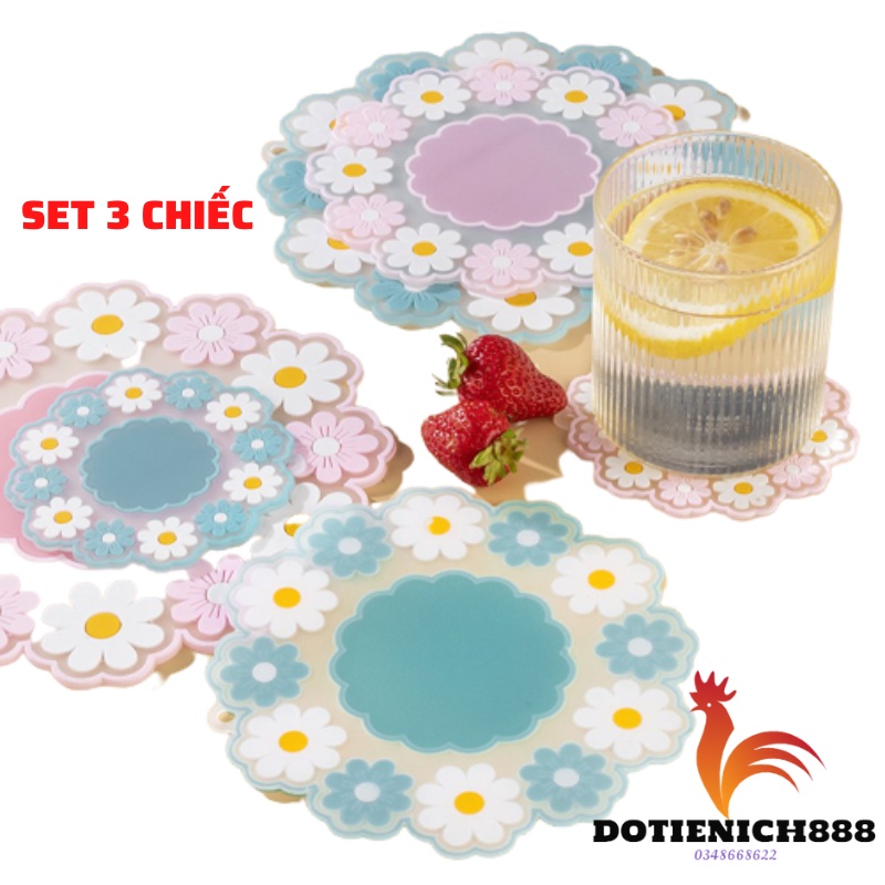 Sét 3 miếng lót cách nhiệt bát đĩa cốc chén xoong nồi silicone đa năng hình hoa cúc trang trí xinh xắn