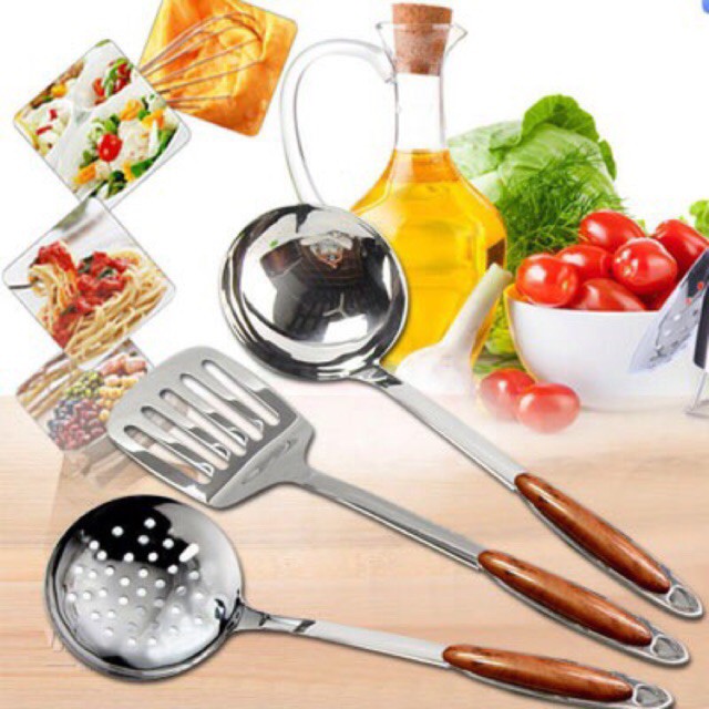 Nhà cửa & Đời sống > Dụng cụ nhà bếp > Cây vét bột & đồ gắp thức ăn || Bộ set 3 môi,xẻng, chao inox 100% cán vânCòn hàng