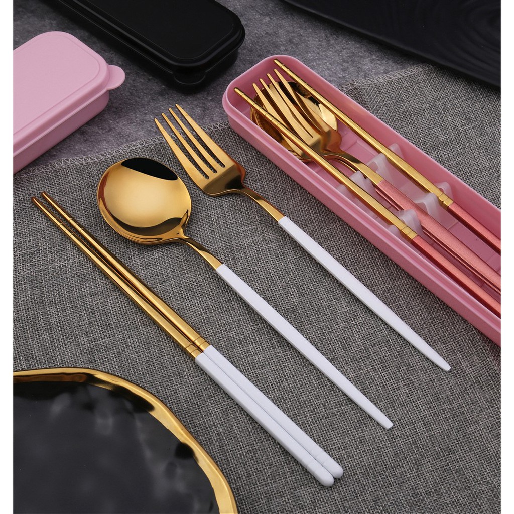 Set 3 Món Muỗng Đũa Nĩa Inox Cao Cấp Phủ Bóng Mạ Vàng Sang Trọng #C403