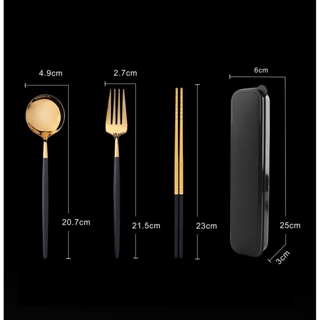 Kích thước: Hộp đựng 25×3×6cm; Muỗng 20×4.9cm, Nĩa 21.5×2.7cm, Đũa 23cm.