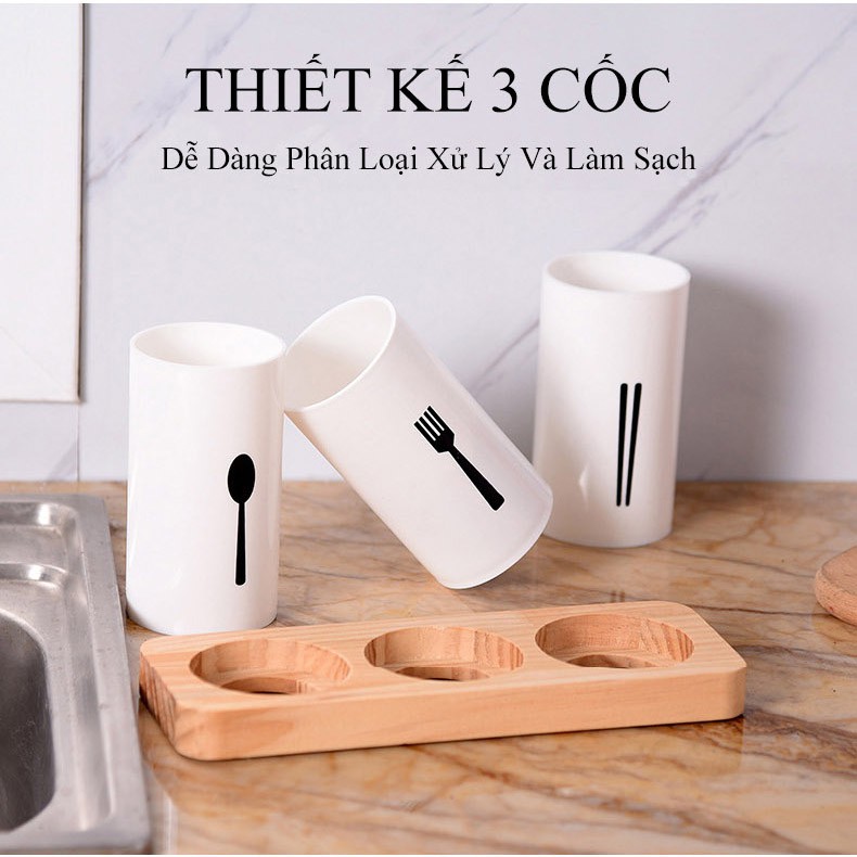 SET 3 ống cắm đũa muỗng nhà bếp cao cấp kèm đế gỗ sồi, ống cắm đũa thìa đa năng FAMAHA
