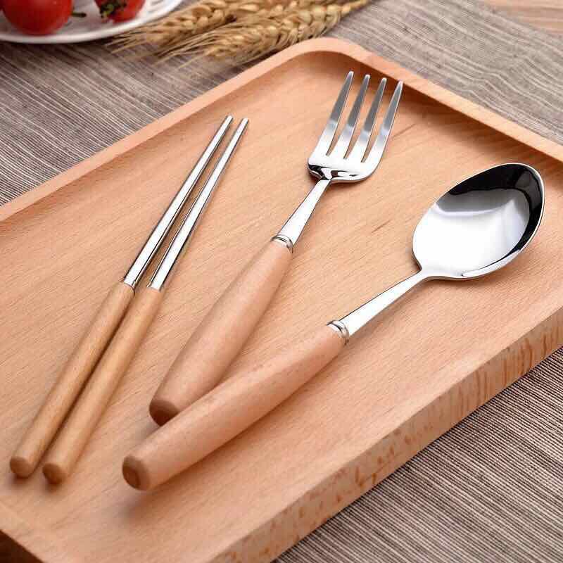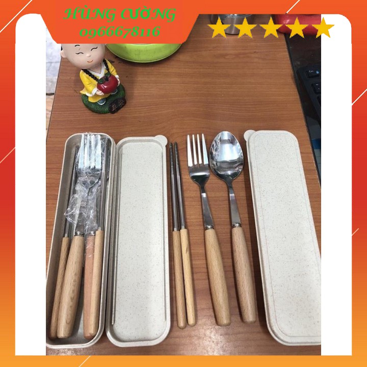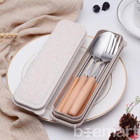- Bộ gồm đũa, thìa và dĩa inox rất đẹp cán gỗ sồi, đựng trong 1 hộp nhựa lúa mạch sang trọng. Dùng mang cơm đi làm, mang đi du lịch hay picnic tiện lợi.