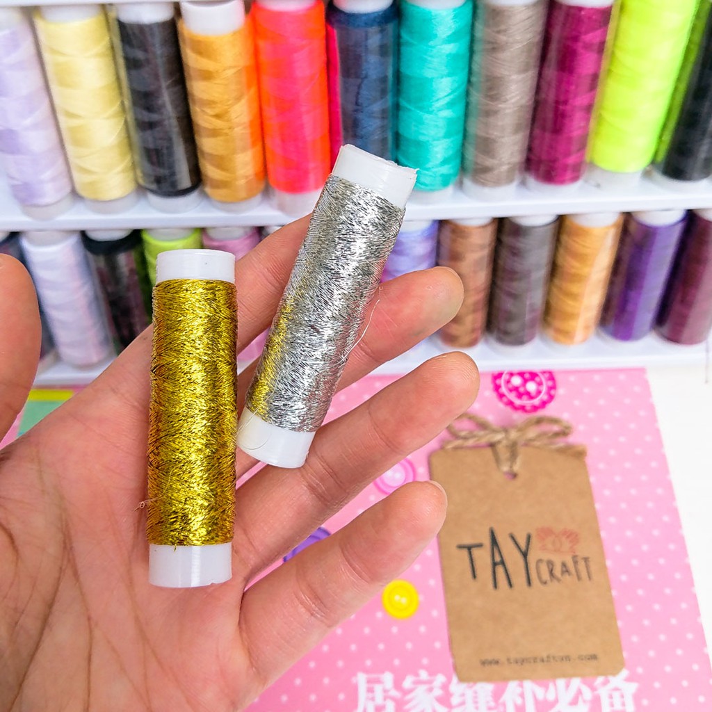 - Chiều dài mỗi cuộn chỉ: Khoảng 182m, riêng cuộn kim tuyến màu vàng và bạc dài khoảng 109m