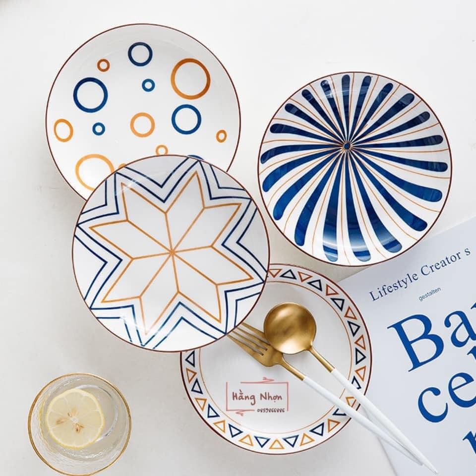 Set 4 đĩa gốm sứ 20cm họa tiết hoa văn vẽ tay phong cách Nhật Bản